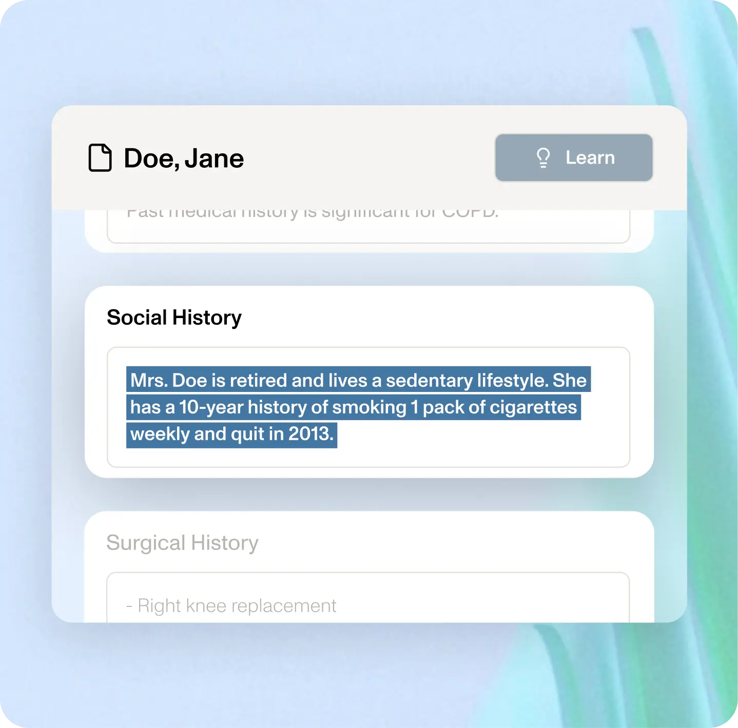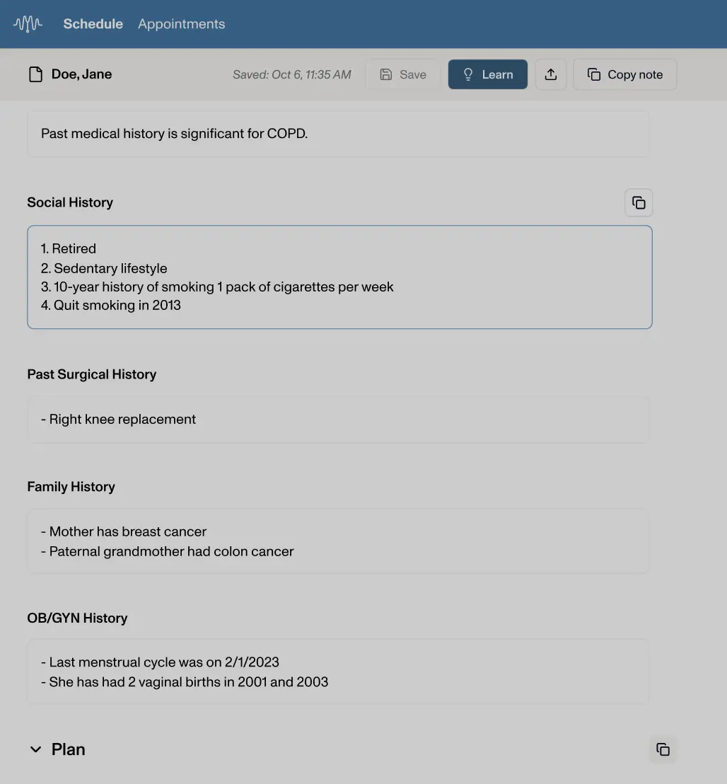 DeepScribe analyzes past notes and learns your style, structure, and phrasing, so that your very first note already reads like yours.